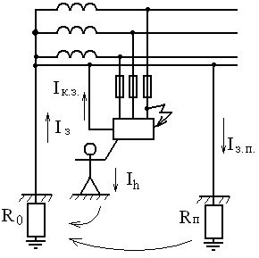 При замыкании фазы на корпус и отсутствии обрыва ток через человека при использовании повторного заземлителя