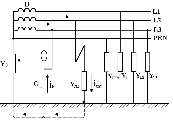 Рис. 3.11. Однофазное прямое прикосновение в сети с заземленной нейтралью типа TN-C при нормальном режиме работы