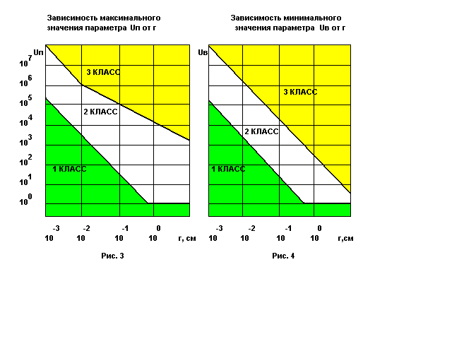 Затем с помощью рисунка 3 и рисунка 4 определяют класс опасности лазера по первичным и вторичным биологическим эффектам соответственно. На рисунке 3 и рисунке 4 кривые 1 и 2 определяют зависимость максимального значения Uп и Uв для лазеров Ι и ΙΙ классов опасности.