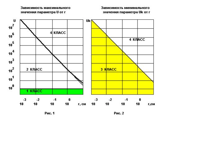 Класс опасности лазера определяется с помощью рисунка 1, где на оси ординат отложены значения радиуса пучка r, а на оси абсцисс – значения безразмерного параметра U. Кривые 1 и 2 определяют зависимости максимального значения U от r для Ι и ΙΙ классов опасности лазера соответственно.