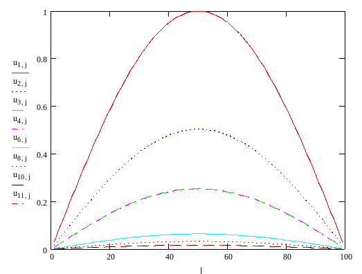 На рис.2 представлен расчет установления температуры в стержне, проведенный по неявной схеме (7.3.5), при следующих начальных и граничных условиях: