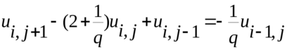 для аппроксимации первой производной в начальной точке. Использование конечной разности первого порядка точности вносит на начальном этапе ошибку большую, чем при аппроксимации уравнения во внутренних точках. В результате получаем для значений на слоях