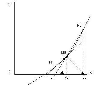 Приближение x ⁿ получается как абсцисса т. пересечения с 0 x секущей, проходящей через т. М ⁿ и N ⁿ c координатами (x ⁿ , f(x ⁿ)) и (z ⁿ , f(z ⁿ )).Значение z ⁿ соответствует абсциссе т. пересечения с осью 0x прямой y = f(x ⁿ ) – (x - x ⁿ ), проходящей через т. Мⁿ и параллельной прямой y = - x.