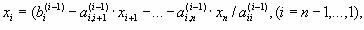 Обратный ход. Из последнего уравнения системы (2) вычислим хn. Подставляя полученное значение в предпоследнее уравнение, вычислим значение хn-1. Таким образом, можно вычислить значения всех неизвестных. Вычисления здесь проводятся по формулам: