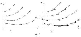 Геометрическая задача интегрирования дифференциальных уравнений состоит в нахождении интегральных кривых, которые в каждой своей точке имеют заданное направление касательной. Для того чтобы выделить из семейства решений дифференциального уравнения (1) конкретное решение, задают начальное условие: y(t0)=y0