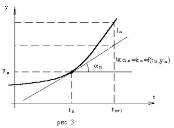 Геометрическая интерпретация одного шага метода Эйлера заключается в аппроксимации решения на отрезке [tn, tn+1] касательной y = yn + y' (tn) (t-tn), проведенной в точке (tn,yn) к интегральной кривой, проходящей через эту точку. Таким образом, после выполнения N шагов неизвестная интегральная кривая заменяется ломаной линией, для которой угловой коэффициент kn очередного n - го звена равен значению f (tn, yn). (рис. 3)