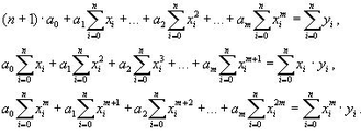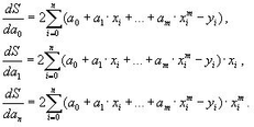 Поскольку в этом случае параметры a0,a1,...,am выступают в роли независимых переменных функции S (1), то ее min найдем, приравнивая к 0 частные производные по этим переменным: