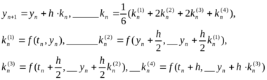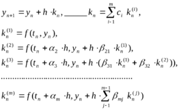 позволяющие последовательно вычислить приближения k y(tn(2)), ..., y(tn(m)). Обозначим через yn(i) вспомогательные величины, являющиеся приближениями k y(tn(i)). Пусть kn(i) = f (tn(i), yn(i)) - приближение к значению углового коэффициента k в точке tn(i). В этом случае расчетные формулы примут вид: