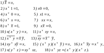 Соотношения 12) и 13) носят название формул де-Моргана. Эти и другие тождества могут быть доказаны с помощью таблиц истинности (см. ниже).