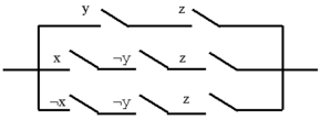 Каждой последовательно-параллельной схеме можно поставить в соответствие формулу логики булевых функций, реализующую функцию проводимости этой схемы. Две схемы считаются эквивалентными, если они имеют одинаковую функцию проводимости. Применяя равносильные преобразования, можно упрощать релейно-контактные схемы, заменяя их эквивалентными, с меньшим числом контактов.