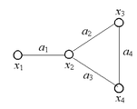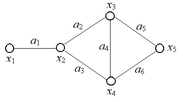 В изображенном на рис. 3.5 графе рассмотрим два маршрута из вершины x1 в вершину x4: M1 = (a1, a2, a4) и M2 = (a1, a2, a5, a6). Длина маршрута M1 равна 3, а длина маршрута M2 равна 4.