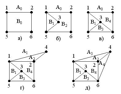 совместим с двумя гранями A0 и B4 (случай 3). Возьмем, например, цепь (1, 4, 2) и поместим ее в грань A0. Получаем две новые грани: A1 – внешнюю к (1, 4, 2, 6, 5, 1) и А2 – внутреннюю к (1, 4, 2, 1) (рис. 11.3, г).