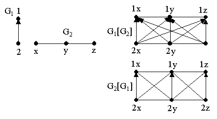 еформально: Композиция G1[G2] означает, что каждая вершина G1 заменяется на копию Ga = G2, а затем, если (a1,a2)