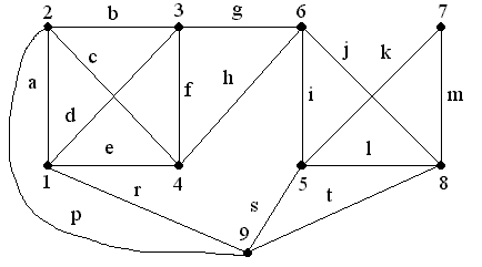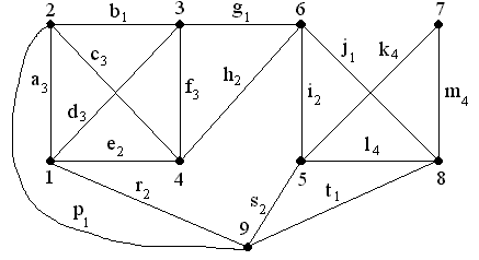 Случайно выбирая в каждой попавшейся в маршруте вершине очередное ребро (среди ребер, не имеющих индекса), строим первый основной цикл с началом в вершине 9. Пусть это будет цикл 9p2b3g6j8t9. При строительстве этого цикла частных циклов не образовалось.