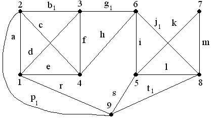 Пусть vнач= 9, i = 1, j = 1 (i – формирователь индексов ребер основных циклов, j – формирователь индексов ребер частных циклов, возникающих при построении очередного основного цикла).