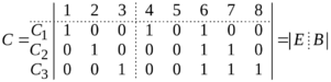 В каждом цикле имеется одна хорда hi и некоторое множество ветвей остова T. Этой хорде hi и ветвям, входящим в цикл Ci, присвоим значение 1, остальным ребрам графа присвоим значение 0. Повторяя процедуру для всех хорд, получим матрицу строк из 0 и 1.