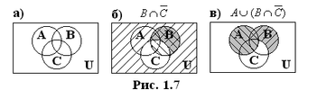Начнем с общей диаграммы, показанной на рис. 1.7,а. Прямоугольник – универсальное множество U. Круги – множества A, B, C.