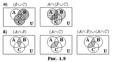 Построим теперь диаграммы Эйлера–Венна. Левая часть равенства представлена на рис. 1.8,а, правая – на рис. 1.8,б. Из диаграмм очевидно равенство левой и правой частей иллюстрируемого соотношения.
