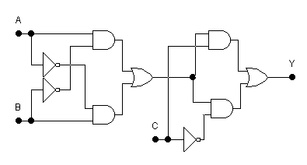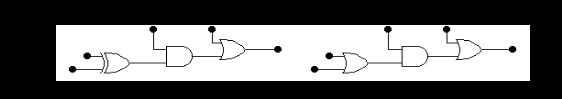 При монтаже схемы, приведенной на рис 13,а, была допущена ошибка: вместо элемента ИСКЛЮЧАЮЩЕЕ ИЛИ был использован элемент ИЛИ (рис 13,б). Найдите комбинации входных сигналов, которые позволяют выявить ошибку монтажника.