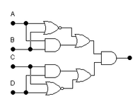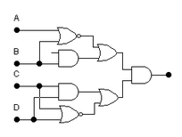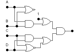 Найдите аналитическое выражение функции, которая реализуется схемой, приведенной на рис. 5. Соберите схему, подключите входы D, С, В, А к источнику логических сигналов, а выход — к логическому пробнику.