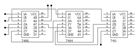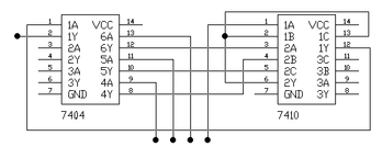 роведите анализ работы логического устройства, собранного на микросхемах 7404 и 7410, показанного на рис. 8. Определите, какую математическую операцию выполняет данное устройство, если комбинации логических уровней на входе рассматривать как числа.