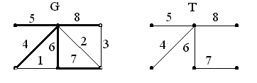 Имеем Ti, среди всех ребер находим ребро с минимальным весом такое, которое смежно с одним из ребер из Ti и которое не образует циклов.