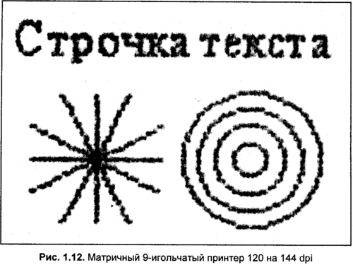 Качество печати для матричных принтеров определяется погрешностями механики и износом красящей ленты. Здесь красящая лента выработала свой ресурс наполовину, поэтому изображение получилось как бы "в градациях серого цвета". Кроме того, полутоновый характер изображение имеет и из-за того, что чернота уменьшается на краях впадин оттиска игл (рис. 1.13). Вообще говоря, матричные принтеры могут печатать и намного лучше. Даже испытуемый принтер может печатать с разрешением 240x216 dpi. Однако драйвер для Windows позволяет установить только 240x144 dpi, а качество практически не улучшается по сравнению с 120x144 dpi (вероятно из-за износа механики).
