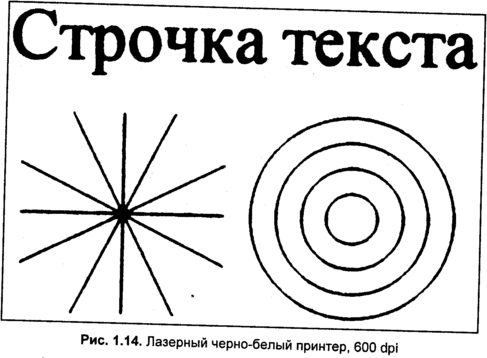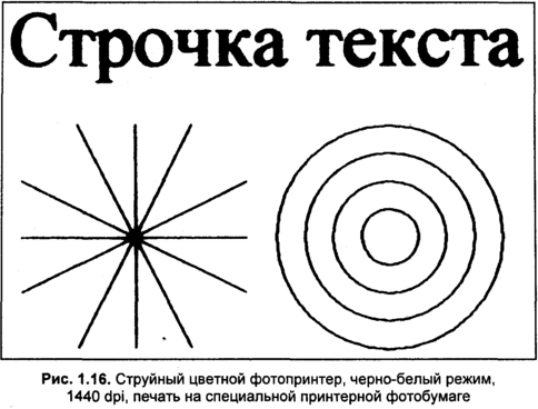 Струйные принтеры достаточно редко соответствуют заявляемой паспортной разрешающей способности. Данная модель, возможно, исключение из общего правила. В черно-белом режиме здесь фактически продемонстрирована точность печати на уровне 600 dpi лазерного принтера (рис. 1.17). Многие другие струйные принтеры с рекламируемым разрешением более тысячи dpi работают еще хуже. И это при печати на специальной бумаге.