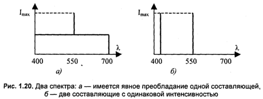 Необходимо также уточнить, что понимается под цветовым тоном. Рассмотрим два примера спектра (рис. 1.20).