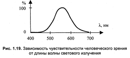 Рассмотрим цвет с позиций волновых свойств. Одной из волновых характеристик света является длина волны — расстояние, которое проходит волна в течение одного периода колебания. Монохроматическим называется излучение, спектр которого состоит из единственной линии, соответствующей единственной длине волны. Радуга, полученная Ньютоном, состоит из бесчисленного множества монохроматических излучений (равно как и радуга, наблюдаемая нами после дождя). Достаточно качественным источником монохроматического излучения является лазер — именно поэтому его луч легко сфокусировать. Цвет монохроматического излучения определяется длиной волны. Диапазон длин волн для видимого света простирается от 380—400 нм (фиолетовый) до 700—780 нм (красный). В указанном диапазоне чувствительность человеческого зрения непостоянна. Наибольшая чувствительность наблюдается для длин волн, соответствующих зеленому цвету (рис. 1.19).