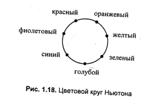 Вторая часть опытов Ньютона такова. Лучи, прошедшие сквозь призму, направлялись на вторую призму, с помощью которой удалось вновь получить белый свет. Таким образом, было доказано, что белый цвет является смесью множества различных цветов. Семь основных цветов Ньютон расположил по кругу (рис. 1.18).