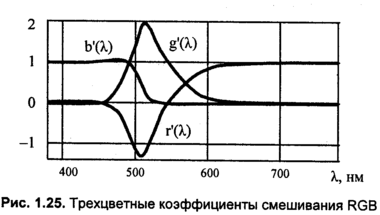 Как видим, коэффициенты r', g' и Ь' могут быть и положительными, и отрицательными. Что это означает? То, что некоторые монохроматические цвета не могут быть представлены суммой компонент R, G и В. Но как отнять то, чего нет? Для уравнивания цвета пришлось добавить к монохроматическому излучению одну из компонент R, G или В. Например, если монохроматическое излучение для некоторого значения X разбавлялось красным, то можно выразить так: