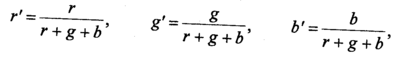 Это уравнение выражает векторы цвета (r', g', b1), лежащие в единичной плоскости r'+g'+b' = 1. Иными словами, мы перешли от куба к треугольнику Максвелла.