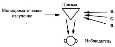 В ходе колориметрических экспериментов были определены коэффициенты (r' g', b'), соответствующие чистым монохроматическим цветам. Простейший колориметр можно представить как призму из белого гипса, грани которой освещают источниками света. На левую грань направлен источник чистого монохроматического излучения, а правая грань освещается смесью трех источников RGB. Наблюдатель видит одновременно две грани, что позволяет фиксировать равенство цветов (рис. 1.24).