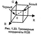 Теперь рассмотрим другие аспекты. Цвет, создаваемый смешиванием трех основных компонент, можно представить вектором в трехмерной системе координат R, G и В, изображенной на рис. 1.23. Черному цвету соответствует центр координат— точка (0, 0, 0). Белый цвет выражается максимальным значением компонент. Пусть это максимальное значение вдоль каждой оси равно единице. Тогда белый цвет— это вектор (1, 1, 1). Точки, лежащие на диагонали куба от черного к белому, соответствуют равным значениям: Ri=Gi=Bi. Это градации серого— их можно считать белым цветом различной яркости. Вообще говоря, если все компоненты вектора (r, g, b) умножить на одинаковый коэффициент (к = 0...1), то цвет (кr, kg, kb) сохраняется, изменяется только яркость. Поэтому, для анализа цвета важно соотношение компонент. Если в цветовом уравнении