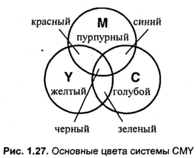 Используется для описания цвета при получении изображений на устройствах, которые реализуют принцип поглощения (вычитания) цветов. В первую очередь она используется в устройствах, которые печатают на бумаге. Название данной модели составлено из названий основных субтрактивных цветов — голубого (Cyan), пурпурного (Magenta) и желтого (Yellow) (рис. 1.27).