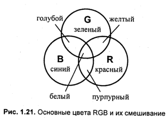 Вкратце история системы RGB такова. Томас Юнг (1773—1829) взял три фонаря и приспособил к ним красный, зеленый и синий светофильтры. Так были получены источники света соответствующих цветов. Направив на белый экран свет этих трех источников, ученый получил такое изображение (рис. 1.21). На экране свет от источников давал цветные круги. В местах пересечения кругов наблюдалось смешивание цветов. Желтый цвет получался смешиванием красного и зеленого, голубой — смесь зеленого и синего, пурпурный — синего и красного, а белый цвет образовывался смешением всех трех основных цветов. Некоторое время спустя, Джемс Максвелл (1831—1879) изготовил первый колориметр, с помощью которого человек мог зрительно сравнивать монохроматический цвет и цвет смешивания в заданной пропорции компонент RGB. Регулируя яркость каждой из смешиваемых компонент, можно добиться уравнивания цветов смеси и монохроматического излучения. Это описывается следующим образом:
