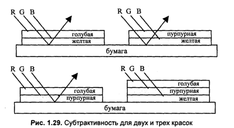 Комбинирование красок позволяет получить цвета, которые остались — зеленый, красный, синий и черный. Черный цвет соответствует поглощению всех цветов при отражении (рис. 1.29).