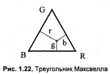 Соотношение коэффициентов r, g и Ъ Максвелл наглядно показал с помощью треугольника, впоследствии названного его именем [1]. Треугольник Максвелла является равносторонним, в его вершинах располагаются основные цвета — R, G и В (рис. 1.22). Из заданной точки проводятся линии, перпендикулярные сторонам треугольника. Длина каждой линии и показывает соответствующую величину коэффициента r, g или Ъ. Одинаковые значения r=g=b имеют место в центре треугольника и соответствуют белому цвету. Следует также отметить, что некоторый цвет может изображаться как внутренней точкой такого треугольника, так и точкой, лежащей за его пределами. В последнем случае это соответствует отрицательному значению соответствующего цветового коэффициента. Сумма коэффициентов равна высоте треугольника, а при высоте, равной единице, — r+g+b = 1.