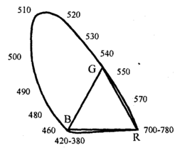 Точки внутри треугольника соответствуют неотрицательным значениям коэффициентов r', g' и b' и представляют цвета, которые можно получить смешиванием компонент RGB.