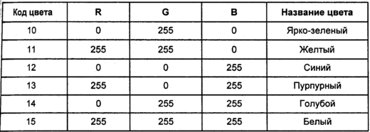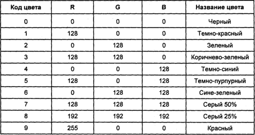 В качестве примера дадим стандартную палитру дисплейных 16-цветных видеорежимов EGA, VGA (табл. 1.3).