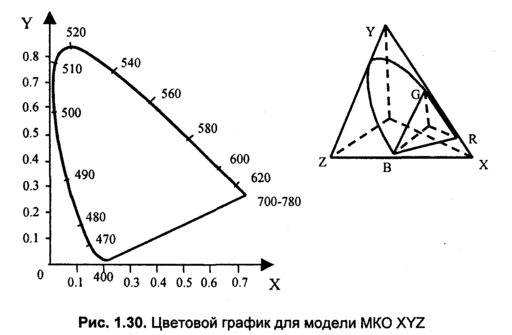 Для решения проблемы отрицательных коэффициентов, которая имеет место для модели RGB, в 1931 году Международной Комиссией по Освещению (CIE) была принятая колориметрическая система XYZ (рис. 1.30). В системе МКО XYZ в качестве основных цветов были приняты также три цвета, однако они являются условными, нереальными [1, 15].