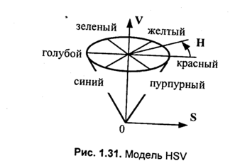 В модели HSV цвет описывается следующими параметрами — цветовой топ Н (hue), насыщенность S (saturation), яркость, светлота V (value). Значение Н измеряется в градусах от 0 до 360, поскольку здесь цвета радуги располагаются по кругу в таком порядке — красный, оранжевый, желтый, зеленый, голубой, синий, фиолетовый (известна поговорка "каждый охотник желает знать, где сидят фазаны"). Значения S и V находятся в диапазоне (0...1). Приведем примеры кодирования цветов для модели HSV (рис. 1.31). При S=0 (то есть на оси V) — серые тона. Значение V=0 соответствует черному цвету. Белый цвет кодируется как S=0, V=l. Цвета, расположенные по кругу напротив друг друга, то есть отличающиеся по Н на 180 градусов, являются дополнительными [28]. Задание цвета с помощью параметров HSV достаточно часто используется в графических системах, причем обычно показывается развертка конуса.