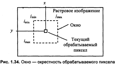 Другую группу методов сглаживания составляют методы обработки уже нарисованного изображения. Для сглаживания растровых изображений часто используют алгоритмы цифровой фильтрации. Один из таких алгоритмов — локальная фильтрация. Она осуществляется путем взвешенного суммирования яркостей пикселов, расположенных в некоторой окрестности текущего обрабатываемого пиксела. Можно представить себе, что в ходе обработки по растру скользит прямоугольное окно, которое выхватывает пикселы, используемые для вычисления цвета некоторого текущего пиксела. Если окрестность симметрична, то текущий пиксел находится в центре окна (рис. 1.34).