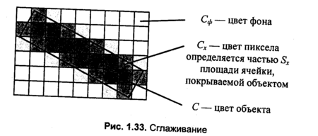 Устранение ступенчатого эффекта называется по-английски antialiasing. Дня того чтобы растровое изображение линии выглядело более гладким, можно цвет угловых пикселов "ступенек лестницы" заменить на некоторый оттенок, промежуточный между цветом объекта и цветом фона. Будем вычислять цвет пропорционально части площади ячейки растра, покрываемой идеальным контуром объекта. Если площадь всей ячейки обозначить как S, а часть площади, покрываемой контуром, — Sx, то искомый цвет равен