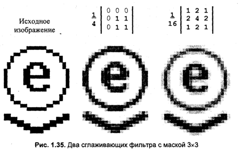 На рис. 1.35 представлены результаты работы двух вариантов сглаживающего нерекурсивного фильтра с окном (маской) 3x3.