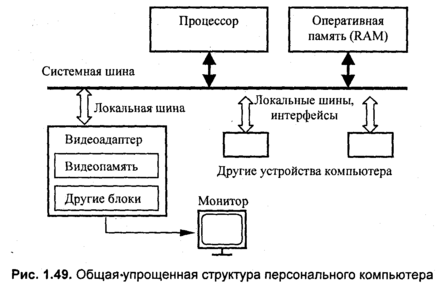 Компьютерные видеосистемы рассмотрим на примере персональных компьютеров класса IBM PC. Первый персональный компьютер фирмы IBM появился в 1981 году. Сейчас уже можно сказать, что появление как раз этого компьютера привело к значительному распространению персональных компьютеров. Некоторые особенности архитектуры IBM PC сохранены и по сей день (рис. 1.49).