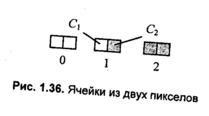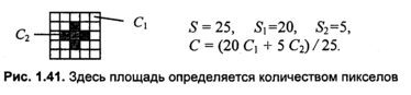 где S— общая площадь ячейки; S1 и S2 — части площади, занятых пикселами цветов C1 и С2 соответственно, причем S1 + S2 = S. Проще всего, когда пикселы квадратные, а их размер равен шагу размещения пикселов. Примем площадь одного пиксела за единицу. В этом случае площадь, занимаемая пикселами в ячейке, равна их количеству (рис. 1.41).