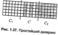 Пример растра с использованием ячеек из двух пикселов приведен на рис. 1.37. Как видим, для создания промежуточного оттенка С ячейки образовывают вертикальные линии, которые очень заметны. Для того чтобы человек воспринял это как сплошной оттенок, необходимо, чтобы угловой размер ячеек был меньше одной угловой минуты. Можно изменять положения таких ячеек в растре, располагая их, например, по диагонали. Это несколько лучше, но не намного.