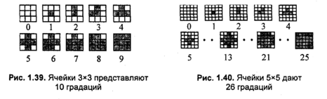 Такой способ можно использовать не для любых вариантов расположения пикселов в ячейках. Конфигурации пикселов должны быть специально разработаны для таких преобразований. Одно из требований можно сформулировать так. Если ячейки разработаны на основе двух цветов, например, белого и черного, а градации изменяются пропорционально номеру ячейки, то необходимо, чтобы ячейка с номером (i) для более темной градации серого содержала бы все черные пикселы ячейки номер (i - 1).